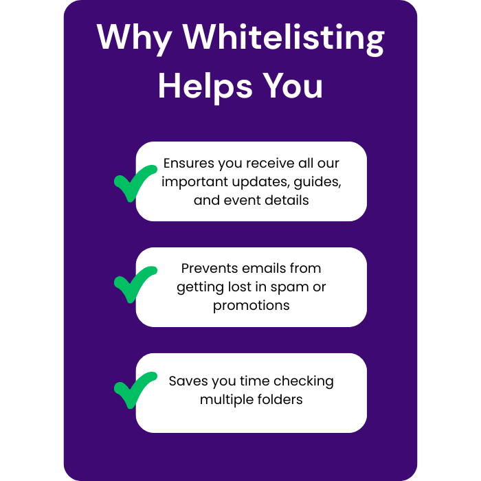 Email whitelisting means telling your email provider that you trust emails from us. When you whitelist an email address, your provider will deliver it directly to your inbox instead of filtering it into spam or promotions.